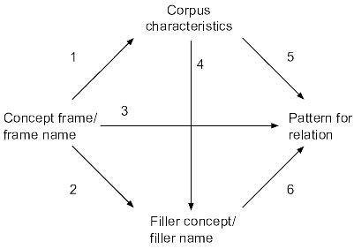 (3) Patterns for a given relation depend on frame name. Cf. patterns with chez, occurring only with PERSON-frames; and different argument positions of frame and filler in patterns with verbs of arity 3 (PERSON vs. ARTEFACT). |